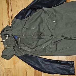 long utility light jacket with faux leather arms and hood. Zips and buttons down the middle with two breast zippers and lower pockets.