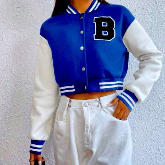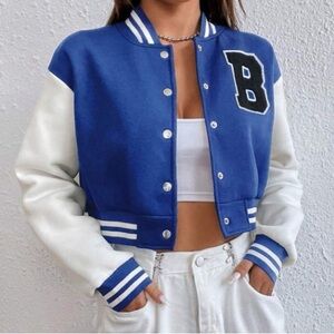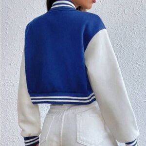 Blue and white varsity jacket w snap button size Large letter blue embroidered on shoulder