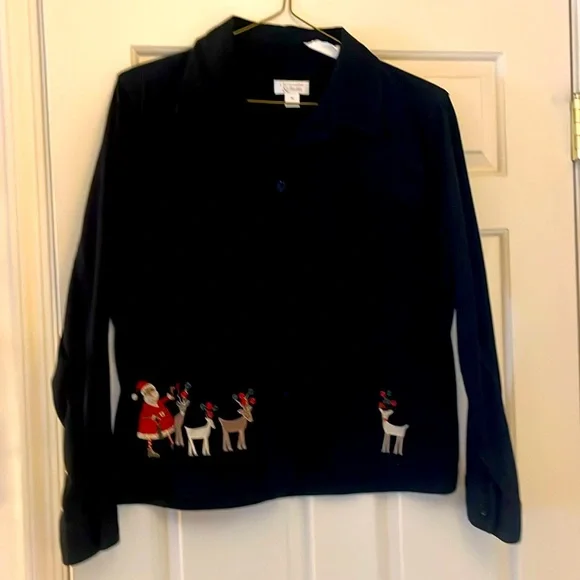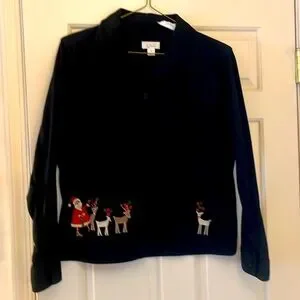 Fun jacket to wear for Christmas! 100% cotton! Size is XL but fits like a L. Colorful appliqué on front and back.