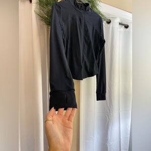 This is the perfect stylish and slim fitting jacket to place over your gym outfit. It is a super cute and sleek cover-up for after your workout and before! The sides are hinged in words, so it appears as if you have a small waist! It is extremely flattering. It is a size medium, but fits as a small.