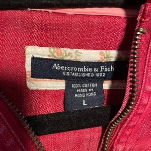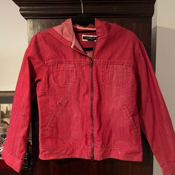 Red crop blue jean jacket- very cute and comfortable. Has a good on it. there is a very small puncture in the back by the hood. will be very easy to sew up- price reflects it. runs small It says large but I would say it's small/medium.