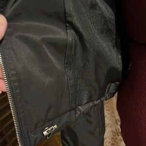 Black Sam Edelman, Moto style jacket, pockets with zippers on both hips, zipper up the front and zipper detail around the neck with leather outline elastic inside to tighten the bottom with snake skin print liner excellent condition