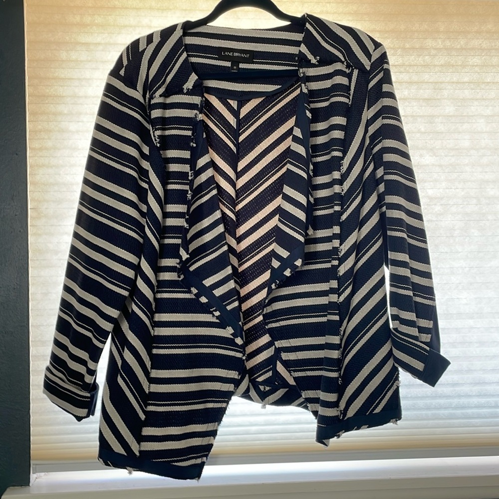 A great transitional jacket in a sturdy fabric in navy and cream. Raw edge trim along some seam work and a dropped lapel make this a modern classic