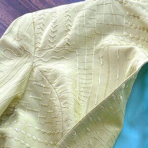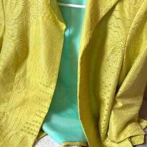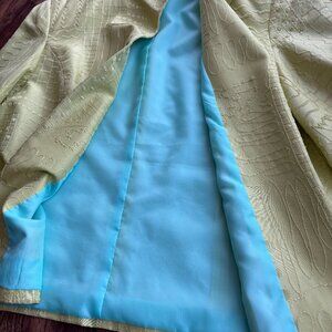 Spring green beauty with striking blue lining. Stand up collar, three quarter sleeves, relaxed fit. Fabric is embossed, raised thread patterns. Ladies Large, is 40 inches across bust (measured underarm seam to underarm seam). Back length is 24 inches. No tags.