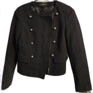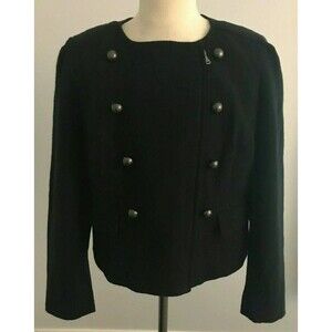 Black Talbots military-style jacket. This jacket is a double-breasted design, featuring silver-toned button detailing and a moto-style asymmetrical zipper closure. The jacket also has subtle shoulder epaulets and flap pockets, contributing to its military aesthetic. The brand is TALBOTS. Type of blazer jacket, size 2.