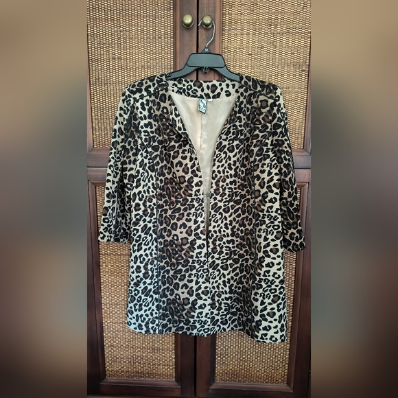 Fun animal print skimmer 3/4 length jacket. Sleeves can be cuffed up or left down. Seamed front & back for a slimming style. Fully lined, dry clean. Hook & eye closures need minor repairs. Dry clean.