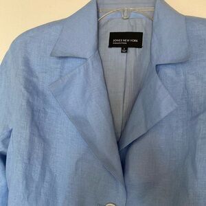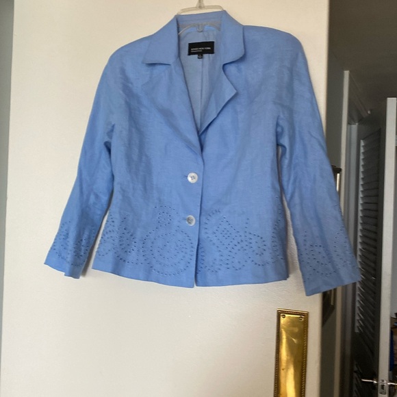 The jacket is a lovely shade of blue, kind of periwinkle. Body is linen, lining cotton, with cutout embroidery at bottom edge.