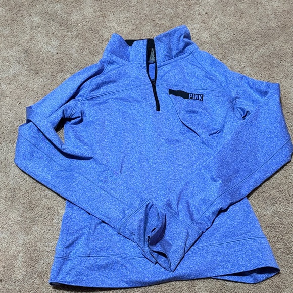 Stylish blue quarter-zip sweatshirt. Features PINK logo on chest. Comfortable and trendy.