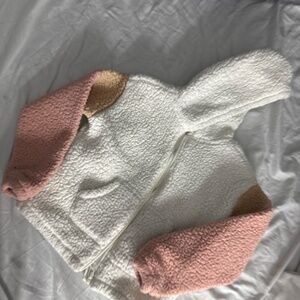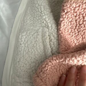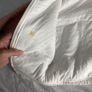 Item is in used condition but is such a cute color block jacket. The inside does have two stains that don’t show at all from the outside of the jacket. It probably can come out if you scrub I have washed it. There is few fuzz balls on some spots but can be removed if you take them off.