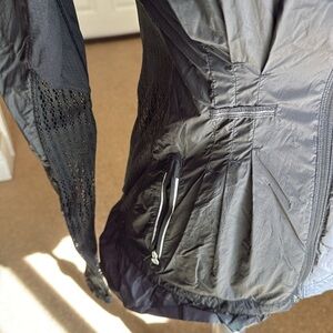 Light weight jack with lace back/sleeves small ruffle at bottom and sleeve runs fitted