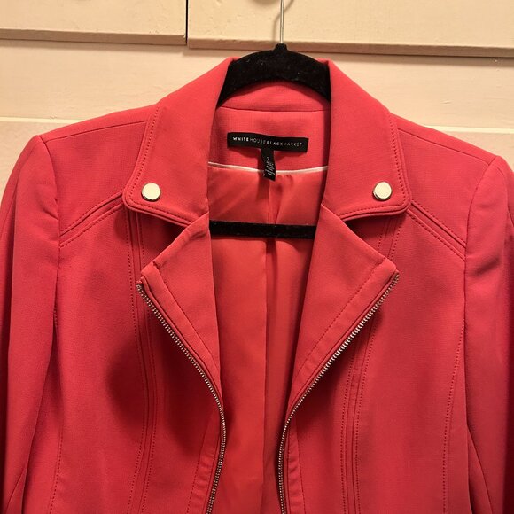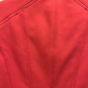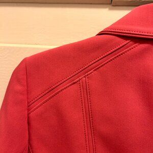 Jacket can be worn on a casual occasion or an night out. It's fun. Only worn once. Length to the hip. The color is not red, more like a dark salmon. Shell:70% polyester, 22% rayon, 8% spandex. Lining: 100% polyester