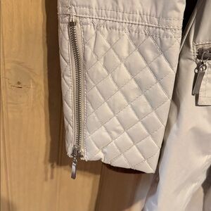 Nice for over a dress as it is a little longer. Draw string. Hoodie. Front zipper pockets. Zipper on arms. I believe it was waterproof. Zipper goes to side not in center. Hole in armpit you will have to sew. I have no time haha