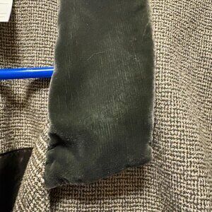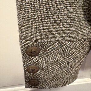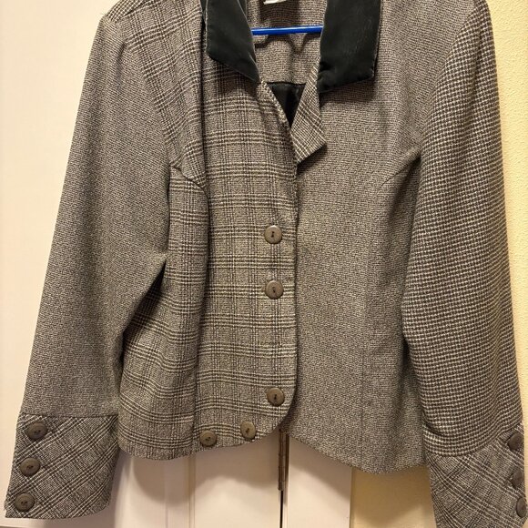 Women's jacket with velveteen collar and cute button details around the cuffs. This jacket hits about hip length and is 40% polyester/60% rayon so requires dry cleaning. The inside is lined.