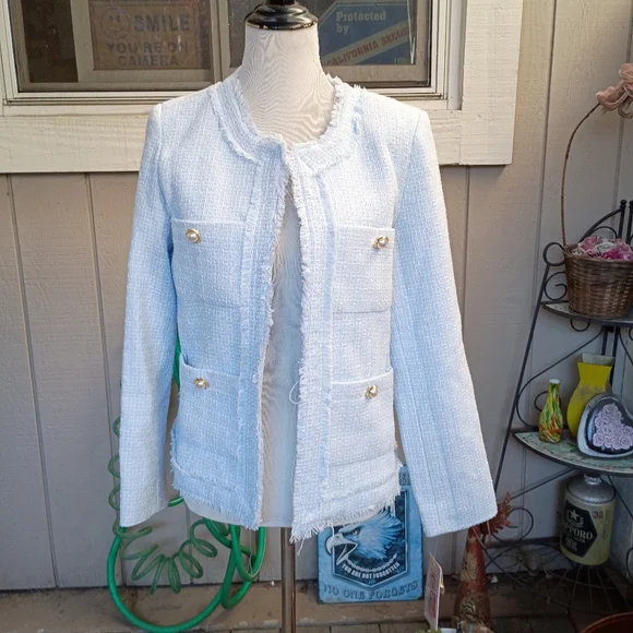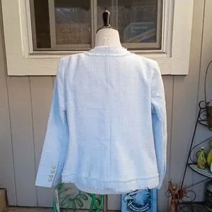 Women's pale blue and white short lined jacket. Jacket has 4 front pockets.