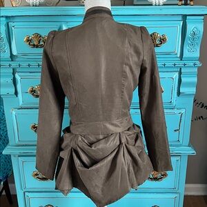 Very funky olive green fitted jacket with leathery trim & ruffles.