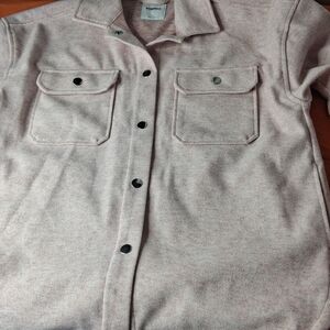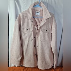 Chic utility jacket with button closures. Features dual front pockets. Soft and comfortable fabric.
