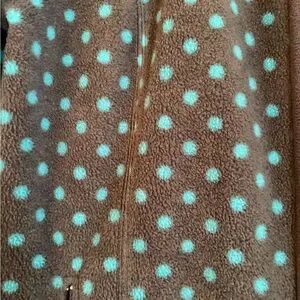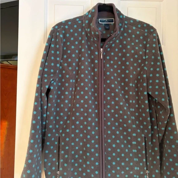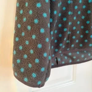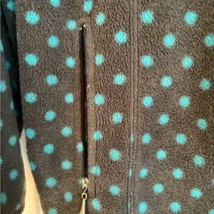 Fleece zipper gray jacket with blue dots. Side zipper pockets. Overall roomy fit with high zippered neck as well. In excellent condition.