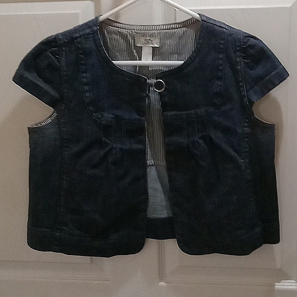 this is a crop style jean jacket from ann Taylor loft. has one closure at top of jacket. medium weight jacket. wore about 3 times. I paid $65.00 will sell for $25