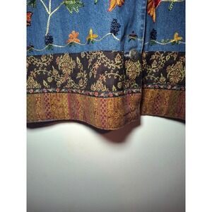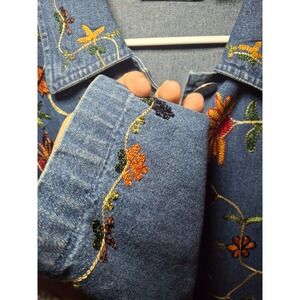 Super cute fall jacket or layering piece nice and light weight made of 100% cotton beautiful fall colors with amazing embroidery all through the front on the collar and on the bottom parts of the sleeves. Very much needed for the fall season coming up it is like new vintage condition womens size large a little over sized. There is some room.