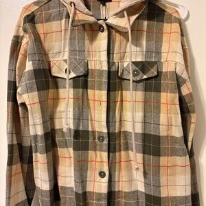 Flannel with detachable hood. Very comfortable and perfect for spring lightweight.