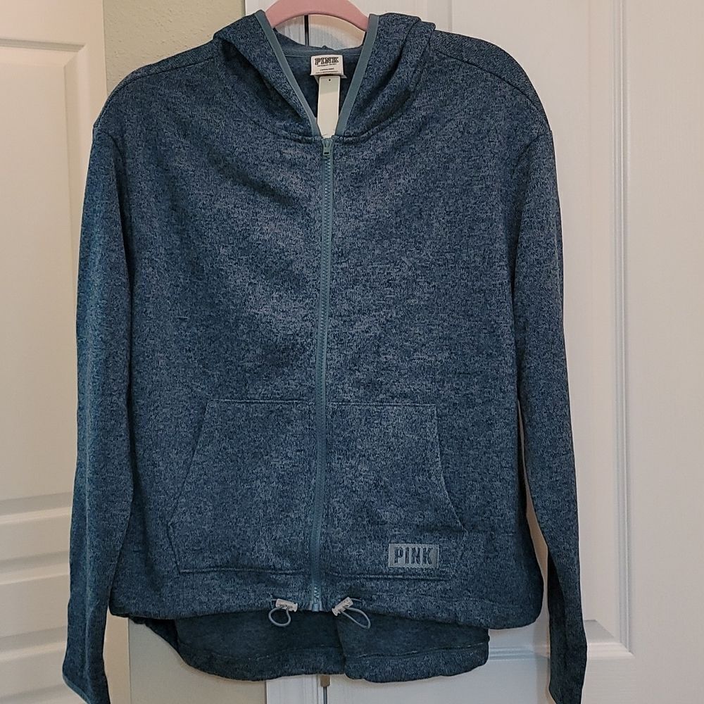 NWT. Beautiful emerald green colored jacket from PINK. It has a full front zipper with 2 pockets. There is a hood and front drawstrings to tighten or loosen. It is very soft and warm.