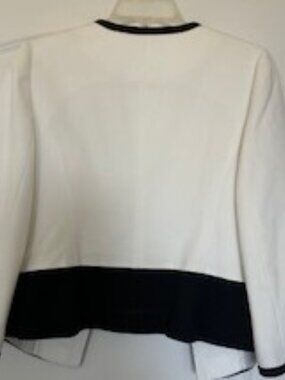 White Jacket with black trim. Fully lined and pairs with black dress with flowers as shown in picture.