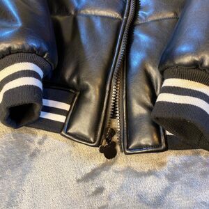 Faux Leather, Quilted Puffer Construction, "M" heart hands & "Mickey" are Embroidered Appliques, a Funnel Neck and Varsity striped Trim,