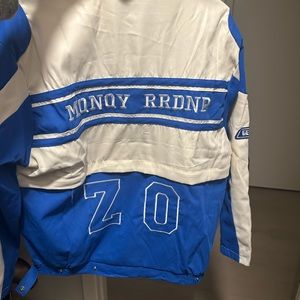 Jacket can ubzip between blue and white sections and turn into cropped jacket and skirt set
