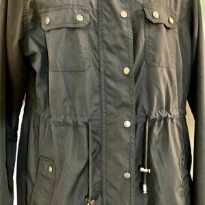Jacket is in good condition showing little if any wear. I find no visible stains or flaws. Measures about 22" across front from underarm seam, about 30" from center back neck to bottom, sleeve from pit to end of sleeve about 19". Removable hood, drawstring at waist for fitted look, zipper and snap closure, upper and lower pockets. A super practical and good looking addition to your coat collection. See photos for details.