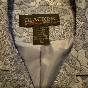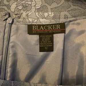 Blue floral design. Jacket and skirt lined. Skirt falls just below the knees. Bottom of skirt is scalloped. Length of skirt from waist to bottom hem is 25". Pic#1 - front. Pic#2 back with zippered closure.