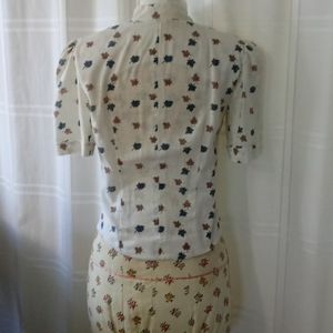 100% cotton fitted blouse. Has high collar, 5 buttons, and short sleeve with a fake cuff. The shoulder pads make it more a jacket more then a blouse
