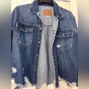 Step into the spotlight with this stunning distressed denim jacket, crafted to perfection for a chic and casual look. This medium indigo jacket, distressed by hand and designed in LA, is brand new and ready to elevate your style with its trendy appeal. Make every outing unforgettable with this must-have piece. Oversized beautifully distressed Denim Jean Jacket not a flaw
