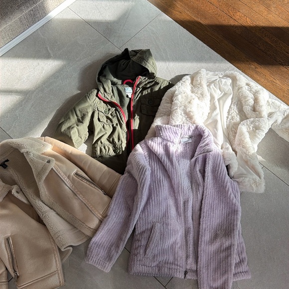 Aqua girls jacket size M. Wear shown in photos. Mostly by the wrist. Columbia jacket size M. Good condition. Some wear on elbow. H&M jacket size 8-10. Good condition. Super fluffy. Old navy jacket size 8