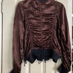 Jacket choc brown zip front long sleeves shirred body & sleeves Darling ties . AdjustAble black ties, black neck, rib, and cuff rib, and bottom rib.. Feels like silk 42" long bust zipped 41" Dleeve length from shoulder 28 inches. Cjoc brown not copper