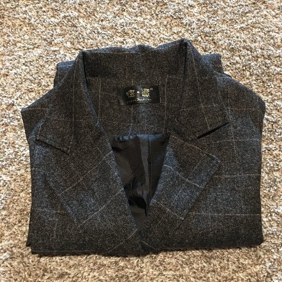 A suit jacket featuring a double breasted button front, sleeveless.