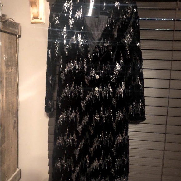 This is a beautiful black with silver through out below knee jacket. It is not lined it still has tag on it that came when I bought it. It says it’s a medium but it fits like a small/ extra small. It is a beautiful jacket/ coat I would love to keep it but it’s to small. If u have any more question please email me or text me or if u would like more pictures