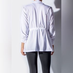 Collar jacket and short sleeves , front zipper , side pockets and adjustable waist with internal elastic.
