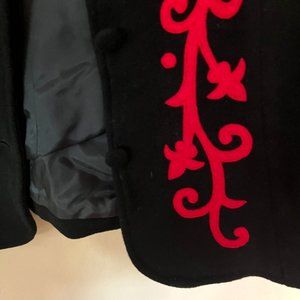 Jacket tailored Collarless Hip length Sz M Wool Blend Black with Red felt Floral