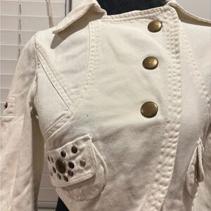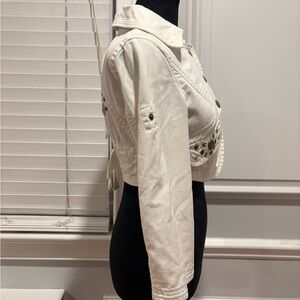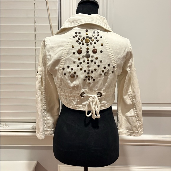 Stylish white jean jacket. Features unique studded design on the back. Cropped fit with adjustable tie.
