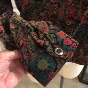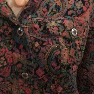 Velour style jean jacket. 5 button front and 2 pockets at breast area. Buttons on sleeve. Lined. Like new.