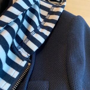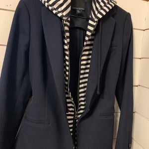 Cynthia Rowley Navy Blue Blazer with a removable navy/white stripe/zip hoodie. Hidden buttons allow you to add/remove the hoodie to the jacket. What a great piece - we are with or without the hoodie to change-up the look.Great work/office piece without the hoodie; great weekend/HH piece with the hoodie! Great streetwear look with sneakers. Material has a bit of a texture/nice weight to it. One button closure/ sharp contemporary look. Hoodie is just the yolk and the front pieces that zip (see photos), it's not a full jacket/hoodie.