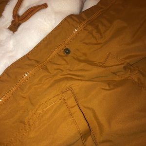 Never worn! Faux fur, water- resistant! Mustard yellow/ khaki color. Drawstring waist ties and drawstring hood. Zippers and buttons over zipper. Finger tip length/ knee length depending on height.