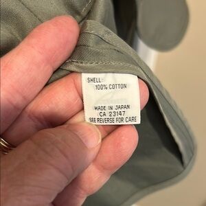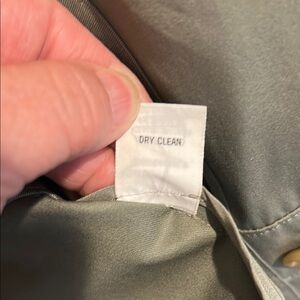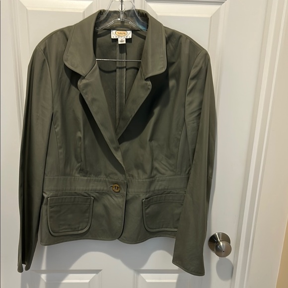 Anyways, this is a Talbots size 14 petite olive green jacket. It has two front pockets and one button closure. It is 100% cotton and it says dry clean.