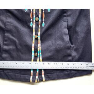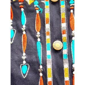 Unique jacket/top by Bob Mackie Wearable Art collection. This is a 97% Cotton / 3% Spandex jacket or top. It is black. The front has a pretty embroidery design that looks 3-D and gives the impression of a necklace type design. The sleeves are 3/4 length with design at the end. It buttons up the front and has slit pockets on either side. It is SIZE MED.