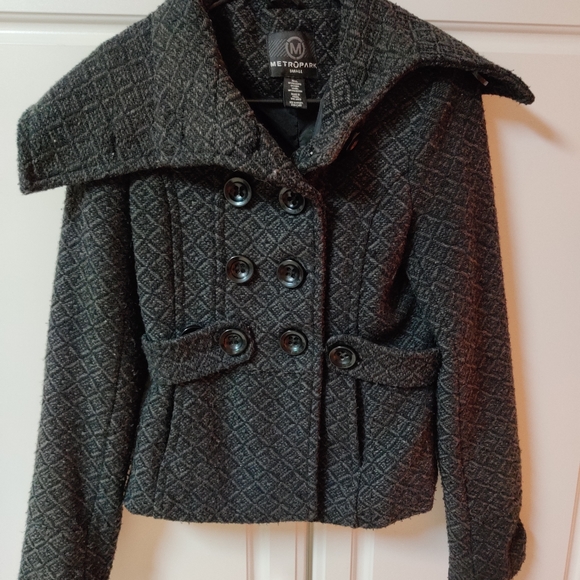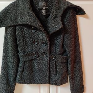 Very pretty with lots of detailing all throughout blazer that is polyester and wool. Buttons side belts all attached in excellent condition.