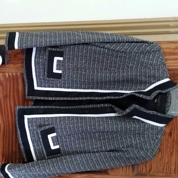 Nice jacket to wear with slacks or capris or skirt. medium to light weight material...this is year round..black and white in excellent condition.