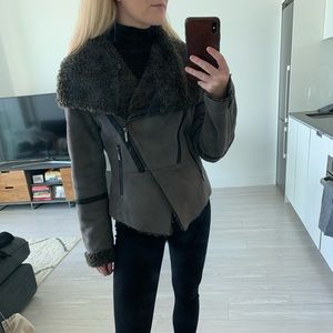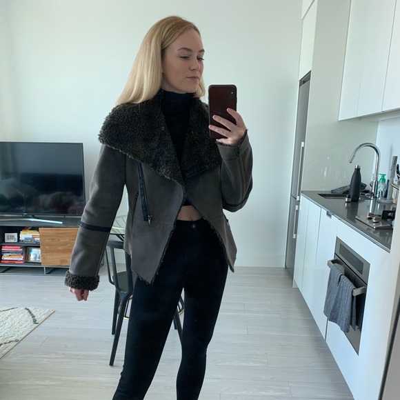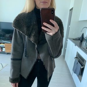 Cozy detailed jacket; teddy material on the inside faux suede in the outside. Color is taupe