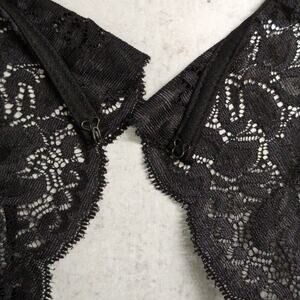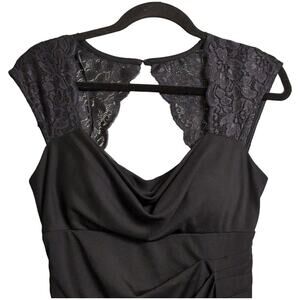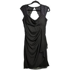 Jackie Jon Black Lace Cap Sleeve Draped Front Keyhole Back Cocktail Dress Size 6
