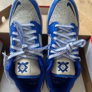 Limited edition Nike Dunk Low x LA DODGERS/ Jackie Robinson #42 sneakers. BNIB , date stamped on shoe box. EXTRA BLUE LACES, clean DEAD STOCK size 9.5 men’s from my personal collection.