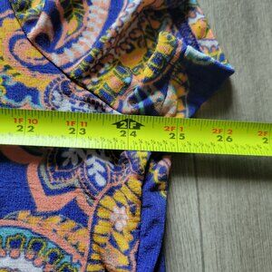 This vibrant paisley print top adds a touch of elegance to casual wear. Its soft fabric blend ensures comfort, with a flattering v-neck design.